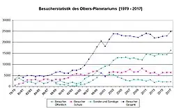 Besucherentwicklung des Olbers-Planetariums von 1979 bis 2017. Ab 2001 wird das Kalenderjahr erstmals als Geschäftsjahr eingeführt