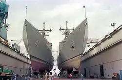 Der Bau der amerikanischen Einheiten erfolgte auf drei Werften. Dies waren an der Westküste zwei Werften der Todd Pacific Shipyards in Seattle, Washington, und San Pedro, Kalifornien, sowie an der Ostküste von Bath Iron Works in Bath, Maine. Von der Kiellegung bis zum Stapellauf vergingen dabei knapp 12 Monate, danach verbrachten die Schiffe bis zur Indienststellung zwischen 12 und 20 Monaten an der Ausrüstungspier. Die Kosten für eine Einheit beliefen sich auf knapp über 200 Mio. US-Dollar, wovon rund 50 Mio. Dollar an die Bauwerft gingen.[1]
