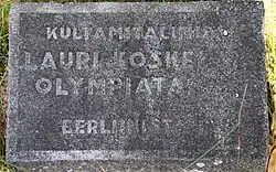 - ↑ Freie deutsche Übersetzung: "Olympia-Eiche – Sten Suvio gewann eine Goldmedaille bei den Olympischen Spielen 1936 in Berlin. Ein Eichensprössling wurde dem Gewinner überreicht. Suvios Eiche wurde auf dem Sportplatz im Zentrum von Viipuri gepflanzt. Im Sommer 1944 wurde sie wegen des Krieges nach Joutseno gebracht und im Hof der Grundschule eingepflanzt. Zur Erinnerung an den 100. Geburtstag des Goldmedaillengewinners am 25. 11. 2011 (Südkarelischer Sportsolidaritätsverband, Joutseno Distriktsverband)"