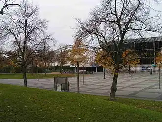 1991 wurde für die nach München vergebene Eiskunstlauf-Weltmeisterschaft die dafür notwendige zusätzliche Trainingshalle an der Ostseite auf Pfeilern errichtet, um die Kapazität des östlichen Parkplatzbereiches des Olympiaparks zu erhalten.[16] Die Trainingshalle ist mehrfach prämiert worden.