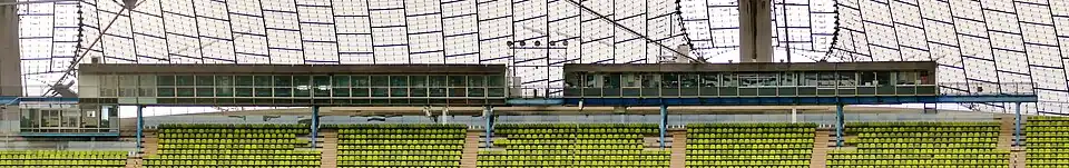 Das Olympiastadion München war das erste Stadion Deutschlands, das über einen VIP-Bereich verfügte.[151] In diesem Bereich, gelegen im Inneren der Haupttribüne, befinden sich zudem diverse Lounges. An der Tür zwischen Außen- und Innenbereich sind an der Außenseite am oberen Türrahmen Heizstrahler installiert.[136] In der Mitte der Haupttribüne im Westen gibt es einen besonders komfortablen Bereich mit besseren Sitzen, Teppichboden und mehr Beinfreiheit, der bei den Olympischen Spielen für IOC-Mitglieder und Staatsmänner vorgesehen war.[151] In den 1990er Jahren war als Teil der verworfenen Stadionmodernisierung vorgesehen, die Plätze in den VIP-Logen auf 600 zu erweitern. Zudem sollte die Zahl der Sitzplätze auf rund 70.000 erhöht und die Haupttribüne um einen dreistöckigen Anbau mit Pressezentrum und Gastronomiebetrieb erweitert werden.[77]