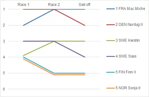 | Rang | Land | Crew | Yachtname | Rennen 1 | Rennen 2 | Gesamt | ||