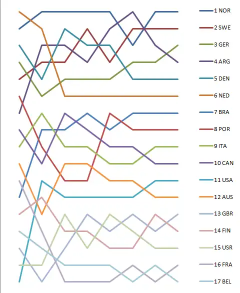 | Rang | Nation | Crew | Rennen I | Rennen II | Rennen III | Rennen IV | Rennen V | Rennen VI | Rennen VII | Punkte | ||||||||