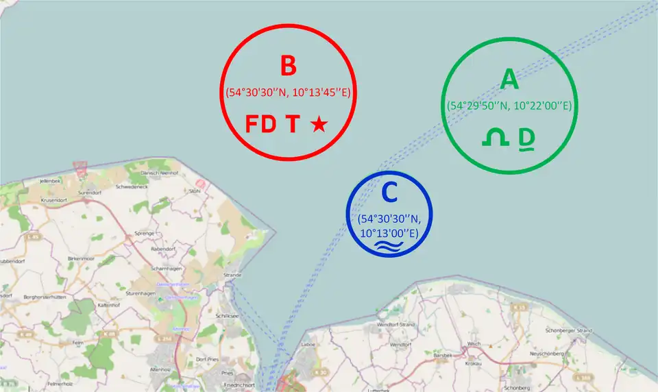 Für die Regatta wurde der Regattakurs A (Alpha) genutzt (grün). Die Abbildung zeigt den Mittelpunkt bei (54°29'50'’N, 10°22'00'’E) mit einem Radius von 2 nautischen Meilen. Dies entsprach der Distanz zwischen Punkt 1 und 3.