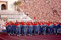 Am 28. Juli um 16:36 Uhr begann die Eröffnungsfeier der Olympischen Sommerspiele 1984, die im Los Angeles Memorial Coliseum stattfand. Zu Beginn der Veranstaltung spielten 110 Trompeter und 20 Kesselpaukisten das „Los Angeles Olympic Theme“. Das Musikstück war von John Williams komponiert worden, der dafür einen Grammy erhielt. Anschließend schrieben fünf Flugzeuge den Schriftzug „Welcome“ in den Himmel und ein „Rocketman“, der einen Raketenrucksack trug und auf dessen Rücken ebenfalls „Welcome“ geschrieben stand, landete im Stadion.[41]