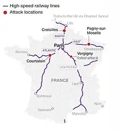- ↑ Sabotages sur le réseau TGV : où en est l’enquête ? franceinfo, 29. Juli 2024, abgerufen am 31. Juli 2024 (französisch).