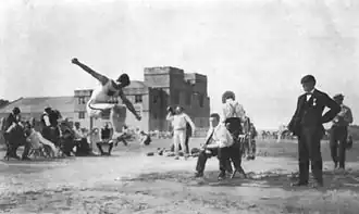 Eine Veranstaltung, die durchaus dem damaligen Zeitgeist entsprach, aus heutiger Sicht jedoch als rassistisch zu werten ist, bildeten die „Anthropologischen Tage“ (Anthropology Days). William J. McGee, Direktor der Abteilung für Anthropologie, hatte bei Sportdirektor James E. Sullivan den Vorschlag unterbreitet, Angehörige „primitiver Stämme“, deren Lebensweise bei den Völkerschauen der Weltausstellung zur Schau gestellt wurde, in sportlichen Wettkämpfen gegeneinander antreten zu lassen.[44] Die Absicht war es, anwesenden Sportfachleuten und Wissenschaftlern zu zeigen, dass der „zivilisierte Mensch“ nicht nur geistig, sondern auch körperlich überlegen sei. Auch sollte die angeblich weit verbreitete Behauptung, die „Wilden“ seien aufgrund ihres Lebens in natürlicher Umgebung grundsätzlich athletischer, widerlegt werden.[45]