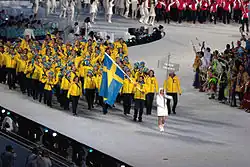 Der Eishockeyspieler Peter Forsberg trug die Flagge Schwedens während der Eröffnungsfeier im BC Place Stadium, bei der Abschlussfeier trug sie der