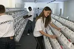 Effektiver ist die Benutzung eines Zwischenlagers, das als Puffer alle aktiven DVDs enthält. Morgens ist das Zwischenlager vollständig leer. Die Angestellten warten die Anlieferung des Transporteurs ab, öffnen zunächst alle Postlieferungen und arbeiten sie schnellstmöglich aber vollständig in das Zwischenlager ab. Dann ist klar, welche DVDs zurückgekommen sind. Erst nachdem alle DVDs zurückgebucht sind, kann im Rahmen eines Matchlaufs ermittelt werden, welche Kunden bei der nächsten Auslieferung welche DVDs erhalten sollen. Dies geschieht automatisch über eine dafür programmierte Software. Dabei entscheidet sich, welche zurückgebuchten DVDs sofort wieder aus dem Zwischenlager in den Versand kommen, welche DVDs ins Hauptlager einsortiert werden müssen und welche DVDs zusätzlich zu den gerade zurückgebuchten DVDs aus dem Hauptlager benötigt werden. Dann werden die neuen Sendungen bestückt, je nach Anbieter entweder im Einzelversand in einem eigenen Umschlag pro DVD oder mit mehreren DVDs in einem Umschlag. Als Letztes werden die Umschläge in der Regel noch vom Verleiher nach Postleitzahlen sortiert und anschließend vom Transportunternehmen abgeholt oder zu ihm gebracht. Am Ende des Arbeitstages ist das Zwischenlager wieder vollständig entleert. Beim Ausfall einzelner Komponenten kann es zu Verzögerungen im betrieblichen Ablauf kommen.