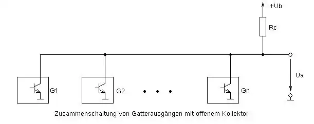 Ein OC wird mit einem Bipolartransistor mit freiem Kollektor-Ausgang realisiert und dient meist dazu, den Anschluss an ein höheres Spannungsniveau zu erlauben oder die logischen Verknüpfungen UND (engl. AND) und ODER (eng. OR) als sogenannte Wired-AND- und Wired-OR-Verknüpfung in Bus-Systemen wie dem I²C-Bus oder von mehreren Chips gemeinsam benutzte Signalleitungen (z. B. Interrupt) zu ermöglichen.