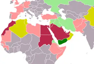 Die vom sunnitischen Königshaus in Saudi-Arabien gestarteten Luftangriffe auf schiitische Huthi-Rebellen im Jemen wurde am 26. März 2015 von mehreren anderen arabischen Staaten unterstützt und von den westlichen Staaten USA, Großbritannien und der Türkei unterstützt oder begrüßt.[106][107] Auf gemischte Reaktionen traf die Militärkampagne dagegen in Iran, in Russland und in China.[107]