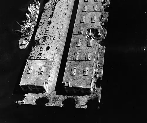 Aufgenommen von der Crew von USS Catoctin: Versenkte Fähre als Blockschiff vor dem Eingang zum Alten Hafen, dahinter das Fort Saint-NicolasZerstörung des Hafens von Marseille: Im unmittelbaren Anschluss an die Razzia von Marseille war in den ersten Februarwochen 1943 das Altstadtviertel Saint-Jean an der Nordseite des Alten Hafens gesprengt worden (Operation Sultan). In Erwartung des alliierten Angriffs machten die deutschen Verteidiger die Kais des Alten Hafens und jene des Neuen Hafens mit in kurzen Abständen gesetzten Sprengungen unbrauchbar. Vor dem Alten Hafen wurde ein Fährschiff als Blockschiff versenkt. Einer der Masten der gesprengten Schwebefähre Transbordeur war zudem in die Hafeneinfahrt gestürzt.