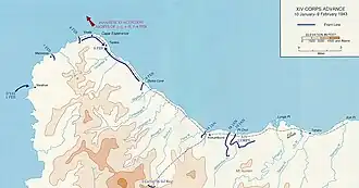 Da General Patch weiterhin eine erneute und verstärkte japanische Offensive befürchtete, befahl er nur einem Regiment die japanischen Streitkräfte westlich von Kokumbona anzugreifen. Die restlichen Einheiten blieben in der Nähe von Lunga Point um den Flugplatz zu beschützen. Die sich nach Kap Esperance bewegenden Reste der 17. Armee konnten von den Amerikanern nur langsam verfolgt werden, da sich diese nur durch einen engen Korridor bewegen konnten, der sich zwischen dem Ozean, dem dichten Dschungel im Landesinneren und den steilen Korallenkämmen befand und maximal nur etwas über 500 Meter breit war.[10] Weitere amerikanische Verstärkung traf am 26. Januar ein. Die Einheiten lagen nun am Fluss Marmura und wurden dort drei Tage lang von den Japanern an der Überquerung gehindert, bis sich diese weiter nach Westen zurückzogen. Am 29. Januar überquerten die Japaner den Fluss Bonegi und Soldaten der 2. Division errichteten dort eine weitere Verteidigungsposition.