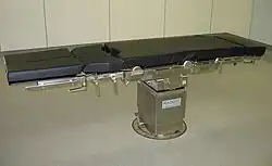 Operationstische müssen beständig gegen Flüssigkeiten und Desinfektionsmittel sein und können idealerweise auch maschinell in einer Dekontaminationsmaschine gereinigt und desinfiziert werden.[2] Sie müssen in einer hochtechnisierten Umgebung auch elektrische Sicherheit gewährleisten. Wenn der Patient sich auf einer trockenen und nicht leitenden Unterlage befindet, ist dies bei der Anwendung von Elektrochirurgie und der Defibrillation gegeben. Bei stark übergewichtigen Patienten wird berücksichtigt, dass nicht jeder Operationstisch für ein hohes Körpergewicht zugelassen ist.[3] Operationstische können beispielsweise für 150 kg oder für bis zu 225 oder gar 360 kg zugelassen sein. Um während der Operation Röntgenkontrollen oder Durchleuchtungen zu ermöglichen, muss die Liegefläche für Röntgenstrahlung durchlässig sein.[4] Elektrisch beheizbare Operationstische waren schon zu Beginn des 20. Jahrhunderts bekannt.[5][6] Mit der Anwärmung des Patienten soll der Auskühlung während der Operation bzw. Anästhesie begegnet und damit dem postoperativen Zittern vorgebeugt werden. Wärmematten auf dem Tisch oder die Anwärmung des Patienten mit Warmluft erfüllen heute diese Aufgabe.