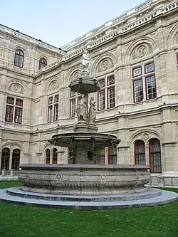 Die gesamte Ostseite der Operngasse zwischen ihrem Anfang und der Ringstraße im 1. Bezirk wird von der 1861 bis 1869 von den Architekten Eduard van der Nüll und August Sicard von Sicardsburg erbauten k.k. Hofoper, der heutigen Wiener Staatsoper, eingenommen, deren Haupteingang sich am Opernring befindet. In der Operngasse befindet sich hier einer der beiden Opernbrunnen, die ebenfalls von den beiden genannten Architekten konzipiert wurden. Er besteht aus Marmor und trägt um einen schlanken Schaft drei flache, oben schmälere Beckenschalen. Die Figuren wurden von Bildhauer Hanns Gasser geschaffen und zeigen oben die Allegorie der Musik, darunter die allegorischen Gestalten von Freude, Ernst und Leichtsinn.