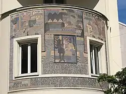 Franz Gessner schuf 1936 diese markante Zwickelverbauung an der Ecke Operngasse / Margaretenstraße 10 am südlichen Ende der Gasse als expressive Ecklösung. Ein Sgraffito am Wohnhaus erinnert an das hier gewesene Freihaus auf der Wieden und an seine Geschichte.