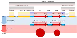 Die funktionelle Einheit eines Operons besteht aus Promotor, Operator(en) und mehreren (Struktur-)Genen, die für Proteine mit typischerweise verwandten Funktionen codieren.[1] Je nach Operon können verschiedene regulatorische Proteine als Repressoren oder als Aktivatoren mit den Operatoren in Wechselwirkung treten und dadurch die Transkription der Gene im Operon an- oder abschalten. Dies hängt jeweils wiederum ab von Wechselwirkungen mit von der Zelle gebildeten oder aufgenommenen Stoffen (Liganden oder Effektormolekülen). Dadurch kann die Synthese der betreffenden mRNA (messenger-RNA) aktiviert oder gehemmt werden, indirekt also auch die Translation der codierten Proteine.