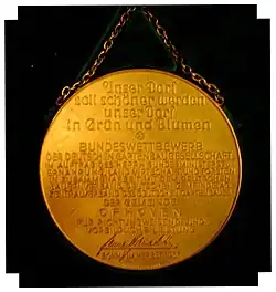 Aber nicht nur auf Landesebene, sondern auch bei einem späteren Wettbewerb auf Bundesebene, bei dem alle Siegergemeinden teilnehmen durften, gewann Ophoven die Goldplakette. In Anwesenheit des damaligen Bundespräsidenten Dr. Heinrich Lübke überreichte der Bundesminister Werner Schwarz bei einer Feierstunde in der Beethovenhalle in Bonn die Goldplakette an Bürgermeister Caron aus Ophoven.