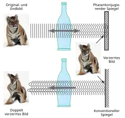 Hierbei wird die Amplitude der Welle erhalten und lediglich die Phase konjugiert. Ein divergenter Lichtstrahl wird so am phasenkonjugierenden Spiegel als konvergenter Strahl reflektiert, im Gegensatz zur normalen Reflexion, bei der er weiter divergiert. Des Weiteren gehorcht er nicht dem Reflexionsgesetz eines gewöhnlichen Spiegels, sondern läuft in sich selbst zurück.