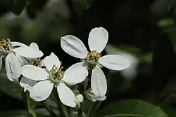 Es werden end- oder achselständige, kurze, dichte und wenigblütige, fein behaarte Schirmrispen an den Zweigenden gebildet. Die duftenden, weißen und gestielten, zwittrigen Blüten sind meist fünfzählig mit doppelter Blütenhülle. Die kleinen, außen drüsigen und bewimperten, eiförmigen Kelchblätter sind meist früh abfallend. Die ausladenden, elliptischen bis verkehrt-eiförmigen Kronblätter sind 1–2 Zentimeter lang. Es sind 10 kurze Staubblätter vorhanden, abwechselnd innen 5 kürzere und außen 5 längere. Die Staubfäden sind unterseits flach und oben kurz, dünn, schlank. Der tief gelappte, fünfteilige und dicht behaarte, an der Spitze kahle Fruchtknoten, aus 5 kurz gehörnten Fruchtblättern, ist oberständig mit kurzem, gerilltem Griffel und gelappter Narbe. Es ist ein Diskus vorhanden.