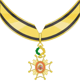 Kommandeure dekorieren die Auszeichnung als Halsorden mit einem 30 mm breiten, ockergelben mit 4 mm breiten schwarzen Seitenstreifen, die 2 mm vom Rand stehen. Kommandeure mit Stern erhalten zusätzlich einen Bruststern. Das einfache Kreuz mit derselben Bandfarbe an der in Spanien üblichen goldenen Querspange an der linken Brustseite. Zum Großkreuz gehört das gleiche hier beschriebene Kreuz, wird aber am Großen Band, das von der rechten Schulter kommend zur linken Hüfte hin getragen. Die Enden sind durch eine Schleife verbunden. Sein ockergelbes Band ist 100 mm breit und hat 12 mm breite ebenfalls schwarze Seitenstreifen, die 6 mm Abstand vom Rand aufweisen. Dazu wird ein Bruststern an der linken Brustseite getragen, dessen Größe sich auf 55 mm beläuft und dessen sieben Strahlen je Kreuzwinkel brillantiert ist.[2]