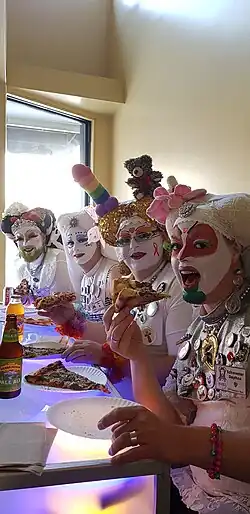 Das häufigste Merkmal der Mitglieder ist das weiß grundierte und farbig geschminkte Gesicht. Weiß symbolisiert den Tod, welchem durch die individuellen farbigen Akzente symbolisch Leben und Freude entgegengesetzt wird.[5] Gemeint ist damit auch explizit der soziale Tod durch Ausgrenzung und Stigmatisierung. Außerdem treten Schwestern in der Öffentlichkeit in nachempfundener Ordenstracht, dem Habit auf. Christliche Ordensschwestern pflegten die Kranken, speisten die Armen, und nahmen Bedürftige in ihre Obhut. Die „queeren Nonnen des 21. Jahrhunderts“ wollen ihre Ziele mit vergleichbarer Konsequenz verfolgen. Einnahmen sollen nicht erzielt werden, Spenden werden aber gesammelt und vorrangig an gemeinnützige Organisationen weitergegeben, die sich um Menschen kümmern, die von HIV und Aids betroffen sind. Safer-Sex-Utensilien, die von den Aktivisten während ihrer Manifestationen verschenkt werden, oder die Speisen und Getränke bei ihren z. B. „Tiergartenpicknick“ genannten öffentlichen Festen, werden von Sponsoren zur Verfügung gestellt.