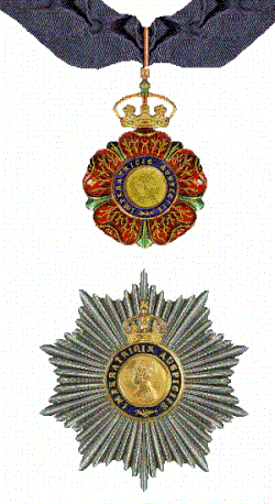 - Das Ordenszeichen wurde als einziges von allen Mitgliedern des Ordens getragen. Es wurde an einem dunkelblauen Band mit weißen Rändern getragen. Knights Grand Commanders trugen das Ordenszeichen an einer Schärpe, die über die rechte Schulter zur linken Hüfte getragen wurde. Knight Commanders und Companions trugen es an dem Band als Halsorden. Das Ordenszeichen selbst war eine fünfblättrige bekrönte rote Blume mit dem Bild von Kaiserin Victoria in der Mitte umgeben von dem oben beschriebenen Band mit dem Wahlspruch des Ordens.