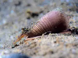 Eine der ersten bekannten natürlichen Organobromverbindungen, das Purpur, kommt in Meeresschnecken aus dem Mittelmeer vor. Die Gedrechselte Kegelschnecke (Conus radiatus) und der Kaiserkegel (Conus imperialis) bilden Peptide, die als Aminosäure 6-Bromtryptophan enthalten.[2] Beispielsweise kommt in Conus radiatus Bromcontryphan, ein Octapeptid mit Bromtryptophan, vor. Das hautreizende Aplysiatoxin stammt aus der Meeresschnecke Stylocheilus longicauda (Familie Aplysiidae).[1] Auch aus Manteltieren, Moostierchen und Korallen sind bromierte organische Verbindungen bekannt. Beispielsweise wurden aus einer Art der Ordnung Weichkorallen mehrere bromierte Azulene wie das Ehuazulen isoliert.[2]