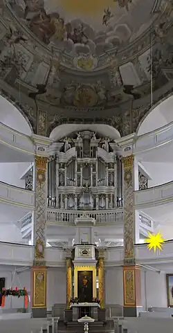 - ↑ Steht auf einer eigenen Windlade, die mit einer Hakenkoppel an das Oberwerk gekoppelt wird.