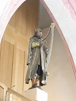 Der Treppenaufgang umschließt eine Säule, auf der sich die König-David-Figur befindet, die bereits Bestandteil der Schwalbennestorgel von 1598 war. Im „Lautsprechergitter“ der Außentüren des Gehäuses befinden sich jeweils drei Figuren, die Orgelbauertätigkeiten darstellen. Nach Plänen von Jakob Schmidt (Orgelbau Goll) wurden sie von der Luzerner Kunstschnitzerin Vreni Tscholitsch geschaffen.