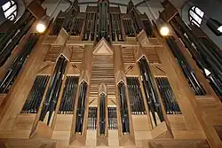 Die Orgel besitzt vier Manuale und ein Pedal mit zusammen 62 Registern und 4.285 Pfeifen. Sie nimmt die Westfassade ab der ersten Empore mit Ausnahme des Teils über dem Brauttor ein. Das Gehäuse hat eine schlichte Form, die durch das unbehandelte Eichenholz einen starken architektonischen Akzent setzt. Es ist 9,10 Meter breit, 13,9 Meter hoch und nur 2,80 Meter tief. Die ansteigenden Läufe der Prospektpfeifen erzeugen eine starke, besonders in den Positivfeldern auffällige Vertikalwirkung. Die gotische Bewegung „himmelwärts“ wird kontrapunktiert durch die Schleierbretter, die eine dachähnliche Bewegung imitieren. Dabei ist kein Feld gleich. Dazu kommen auslaufende und sich verjüngende Spitzen und kleine Turmaufsätze. Diese Stilelemente sind schlicht-moderne Übertragungen gotischer Elemente.[15]