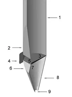 ![]() (1) Pfeifenkörper (2) Oberlabium (3) Kern (4) Seitenbart (5) Aufschnitt (6) Unterlabium (7) Kernspalte (8) Pfeifenfuß (9) Fußloch |