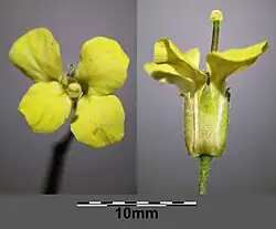 Die zwittrige[5] Blüte ist radiärsymmetrisch und vierzählig mit doppelter Blütenhülle. Die vier aufrechten Kelchblätter sind bei einer Länge von 3,5 bis 5,5 Millimetern elliptisch und nicht gehörnt.[1][4][6] Die blassgelben,[2] verwelkt weißen Kronblätter sind mit einer Länge von meist 8 bis 9 (6 bis 10) Millimetern[1][2] etwa doppelt so lang wie die Kelchblätter und 2,5 bis 4 Millimeter breit; ihr Nagel ist 3 bis 5,5 Millimeter lang.[4][6] Die Staubbeutel sind 1,5 bis 2 Millimeter lang.[2] Der Griffel ist 1 bis 2, selten bis zu 4 Millimeter lang[6] und meist keulen- oder kreiselförmig verdickt.