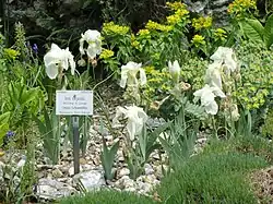 Der Perigon ist cremeweiß bis hellgelblich mit manchmal wenigen unregelmäßigen kleinen hellvioletten bis hellbläulichen Adern (was bei kultivierten Schwertlilien oft ein Zeichen einer Virusinfektion stellt), die später in ein dunkleres Gelb wechseln. Der Bart auf dem äußeren Perigon ist gelb. Die Einzelsegmente des Perigons sind an ihrer Basis in einer 1,9 cm langen Röhre verschmolzen; die Hängeblätter sind spatel- bis eiförmig, ca. 7,5 cm lang, die Breite wächst von 0,6 cm an der Basis bis auf 3,5 cm unterhalb der Spitze, sie sind nah entlang der Mittelvene intensiv gelb bebärtet, auf beiden Seiten des bebarteten Kamms ziehen sich dunkel purpurne Venen bis 2,5 cm oberhalb der Basis ohne deutliche Venen darüber hinaus; die Domblätter sind oval bis eiförmig, ca. 7,5 × 3,7–3,8 cm mit stark wellenförmigen Rand, der Stiel des Domblattes ist 0,7 cm lang. Die Staubblätter mit den Staubfäden sind weiß, 17–18 mm lang, die Breite beträgt an der Basis 1,5 mm und 1 mm unterhalb der Theca; die Staubbeutel sind cremeweiß, 11–12 mm lang und 2 mm breit (0,9 mm für jede Theca). Die annähernd zylindrischen Fruchtknoten sind ca. 2,1 cm lang und haben einen Durchmesser von 0,6 cm; die Griffeläste sind annähernd weiß und nach außen gebogen, 4,7–4,8 × 1,7–1,8 cm, sie sind adaxial gekielt und distal durch zwei Spalten in Loben geteilt die etwa 1 cm von der Spitze beginnen; die Loben sind aufwärts gebogen, die Median gelegenen Ränder sind ganz, die äußeren gezähnt. Die Frucht ist eine mehr oder weniger dreikantige trockene Spaltkapsel. Die Samen sind tropfenförmig (pyriform), nicht auffällig abgeflacht, 6–7 mm lang und ca. 4 mm breit.