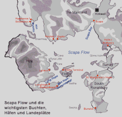 - Scapa Bay im nordöstlichen Teil der Flow. In der Nacht zum 14. Oktober 1939 drang das deutsche U-Boot U 47 unter Kommandant Günther Prien in die mittlerweile stark gesicherte Scapa Flow ein und versenkte das britische Schlachtschiff Royal Oak, die als Flak-Batterie vor Kirkwall lag und sonst nur noch als Ausbildungsschiff und für Aufklärungsfahrten diente. Dabei starben 833 britische Seeleute.
