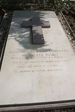 Orlando Lorenzini fiel, von einem Granatsplitter tödlich getroffen, am 17. März 1941 in der Schlacht von Keren, als er seine Askari-Truppen zu einem Gegenangriff sammelte. Wenige Wochen zuvor war er zum Brigadegeneral befördert worden. Posthum wurde er mit der Goldenen Tapferkeitsmedaille ausgezeichnet. Er fand seine letzte Ruhestätte auf dem italienischen Soldatenfriedhof Keren, wohin er 1994 umgebettet wurde, nachdem er zunächst auf dem italienischen Soldatenfriedhof in Asmara beigesetzt worden war.[16][17][1]