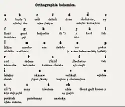 „Da das lateinische Alphabet für die Schreibung der tschechischen Sprache nicht ausreichen kann, weil die tschechisch Schreibenden uneins sind, falsch buchstabieren und sich so das richtige Aussprechen beim Lesen erschweren, habe ich den, wie mir scheint, nützlichen Entschluss gefasst, das lateinische Alphabet zum Zwecke der Schreibung des Tschechischen etwas zu verkürzen, seine Mängel auszufüllen und die verschiedenen Werte der Schriftzeichen festzulegen; deshalb wird das Alphabet zuerst in seinen Schriftzeichen angeführt und dann erst mit Worten als Beispielen erläutert. Eines solchen Alphabetes würden wir Tschechen nicht bedürfen, wenn wir eigene Schriftzeichen hätten, die unserer Sprache angepasst sind.“