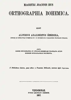 - ↑ Alois Šembera: Mistra Jana Husi Ortografie Česká (Magistri Joannis Hus Orthographia Bohemica). Wien 1857, S. 5–6 (Latein, tschechisch, verfügbar online [abgerufen am 17. Januar 2017]).