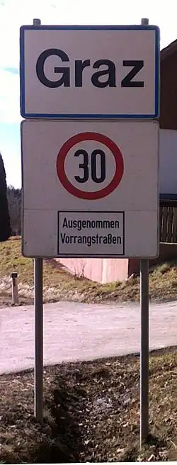 Im Ortsgebiet gilt, so keine andere Geschwindigkeit vorgeschrieben ist, eine Maximalgeschwindigkeit von 50 km/h. Eine Ortsanfangs- oder Ortsendetafel hebt eine bestehende Geschwindigkeitsbeschränkung nicht auf.[3]