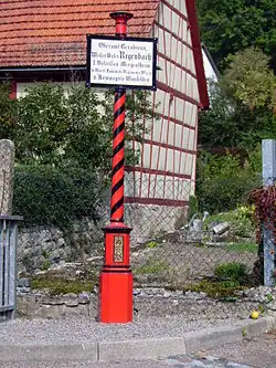 | Blaubach | Teilgemeinde | Gerabronn | Blaufelden | Schwäbisch Hall | Ortsstock (1876)[6] | Dorfeingang | |