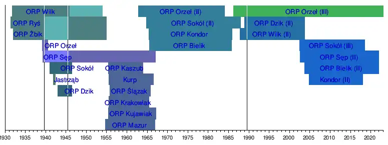 Die noch junge polnische Marine erhielt zu Beginn der 1930er ihre ersten U-Boote. Es handelte sich um drei Boote der in Frankreich gebauten Wilk-Klasse. Kurz vor Beginn des Zweiten Weltkrieges kamen noch zwei Boote der Orzeł-Klasse hinzu, die in den Niederlanden gebaut worden waren. Während des Krieges wurden noch ein altes US-amerikanische S-Klasse-Boot und zwei moderne britische U-Klasse-Boote von den Alliierten übernommen.