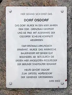 1968 wurde der nahe der Grenze der DDR zu West-Berlin gelegene Ortsteil Osdorf mitsamt den Gutsgebäuden, von denen lediglich eine Scheune erhalten geblieben ist, im Zuge von Grenzsicherungsmaßnahmen der DDR abgerissen.[13] Die rund 150 Bewohner wurden umgesiedelt, zum Teil in das nahegelegene Heinersdorf. Dennoch behielt die Gemeinde den Namen bis zu ihrer Eingliederung in die Gemeinde Großbeeren am 31. Dezember 1999.[14] 2000 wurde der nunmehrige Großbeerener Ortsteil Osdorf in Heinersdorf umbenannt.[13] 1972 kam es zum Zusammenfluss der LPG mit der LPG in Kleinbeeren zur LPG Mahlow-Kleinbeeren. 1973 bestand auf der Gemarkung das VEG Genshagen mit den Betriebsteilen Friederikenhof, Birkholz und Heinersdorf.
