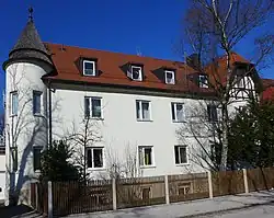 Die zweigeschossigen Krüppelwalmdachbauten mit Zwerchhaus, rundem Eckturm und Zierfachwerk wurden von Georg Völkl im Heimatstil errichtet. Der Bau wurde von 1962 bis 1964 um einen rückwärtigen Trakt erweitert und die Straßenfront wurde bis zur Unkenntlichkeit vereinfacht.