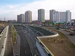 | Siedlung Roździeńskiego von Westen mit den Gwiazdahochhäusern | ||