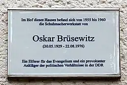 - ↑ Heute erinnert eine von der Stadt angebrachte Tafel am Gebäude Städtelner Straße 3 an Brüsewitz.