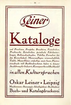 Im Oskar Leiner Verlag wurden neben Publikationen des Reclam-Verlages, Prospekte, illustrierte Kataloge, Broschüren, Preislisten, fremdsprachliche Drucksachen sowie Zeitungsbeilagen gedruckt. Er wurde am 15. Juli 1842 von Oskar Ludwig Raimund Wilhelm Leiner (1814–1873) in Leipzig gegründet. Im Jahr 1946 kaufte der B. G. Teubner Verlag die nicht zerstörte Druckerei Oskar Leiner in der Leipziger Goldschmidtstraße 28 (ehem. Königsstraße 26b).
