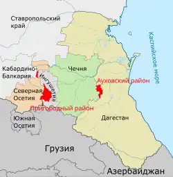 Besonders um die Zugehörigkeit dieses östlichen Teils des Prigorodnyj Rajon (russ. „Vorstädtischer Kreis“) lebte der nationalistische inguschisch-ossetische Konflikt in der Zerfallsphase der Sowjetunion wieder auf und vom 31. Oktober bis 5. November 1992 kam es zu einem offenen Krieg zwischen ossetischen und inguschischen Milizen in dessen Ergebnis fast die gesamte inguschische Zivilbevölkerung aus der umstrittenen Region vertrieben wurde.[11] Zwar kehrte ein Teil der inguschischen Bevölkerung später zurück, aber die Region blieb bei Nordossetien, einige nationalistische inguschische Kreise fordern bis heute ihre Rückgabe.