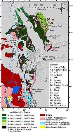 - ↑ Peter R. Johnson & Beraki Woldehaimanot: Development of the Arabian-Nubian Shield: perspectives on accretion and deformation in the northern East African Orogen and the assembly of Gondwana. In: Saudi Geological Survey (utdallas.edu PDF).