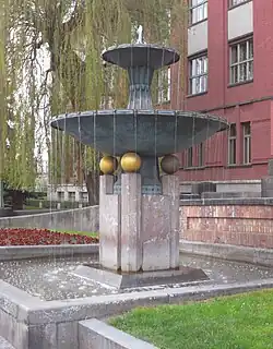Vor dem Gebäude befindet sich der im Gesamtkonzept enthaltene Stadtbrunnen mit aufwendiger Gestaltung, der in Bronze und rotbraunem Kalkstein ausgeführt wurde. Er besteht aus einer doppelten Bronzeschale, die überhöht auf einem Kalksteinsockel ruht und ihr Wasser über zahlreiche Ausläufe an ein unteres rechteckiges Becken abgibt.