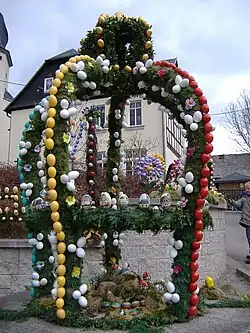 In deutschsprachigen Ländern und den Niederlanden suchen die Kinder bunt bemalte versteckte Hühnereier und Süßigkeiten, die vom „Osterhasen“ versteckt wurden. Es gibt auch den Brauch, Zweige in Vasen oder auf Bäumen im Garten mit bunt bemalten Ostereiern zu schmücken. Als Ostergebäck gibt es einen Kuchen in Hasen- oder Lammform. Bräuche zum Osterei sind das Ostereiertitschen, Ostereierschieben, Ostereierwerfen, Stüpen und Eierschibbeln.[21]